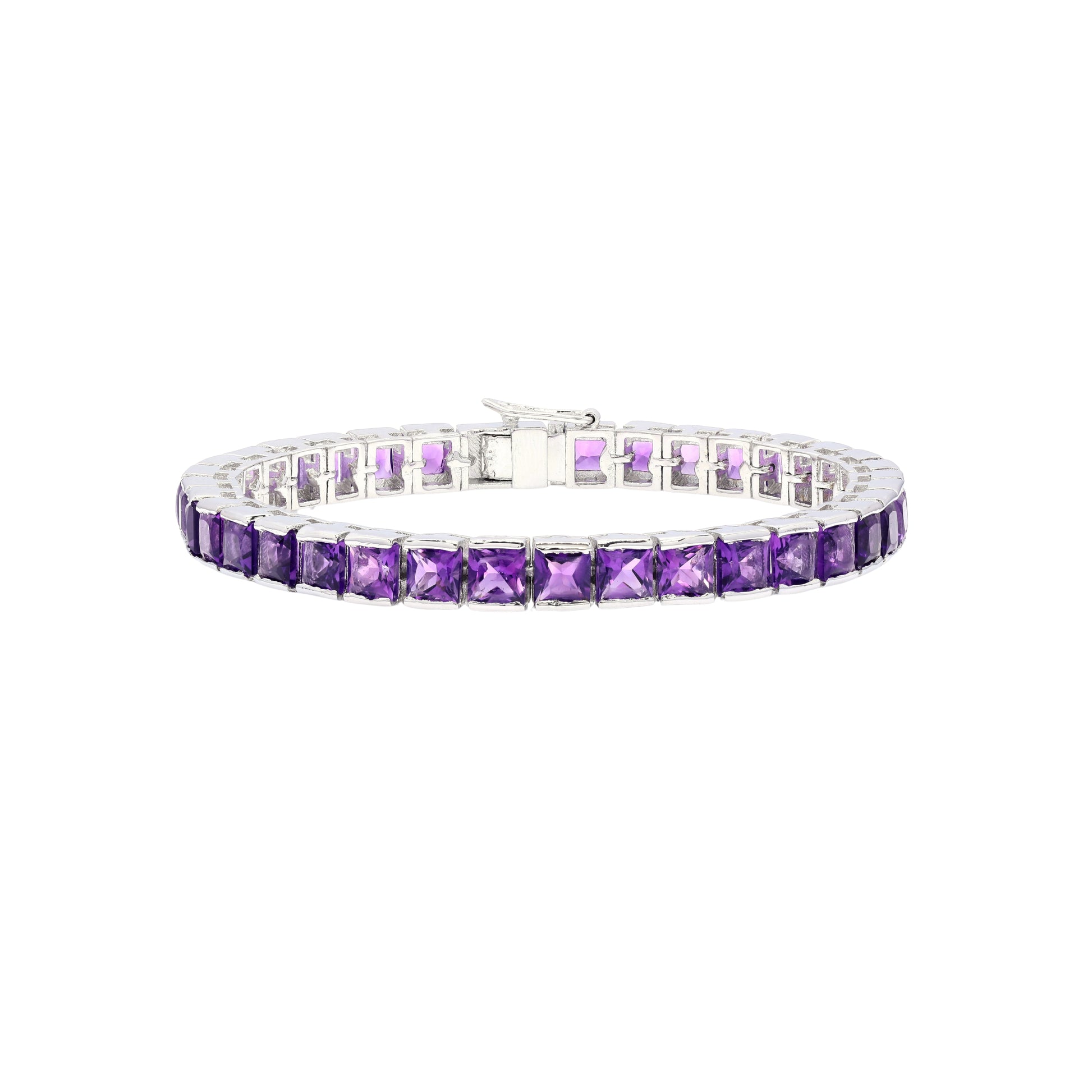 Adorn your wrist with the dazzling beauty of this amethyst tennis bracelet. The brilliant purple, princess-cut amethysts symbolize wisdom and creativity, while the gem itself is believed to support hormonal balance, encourage restful sleep, and act as a detoxifier.