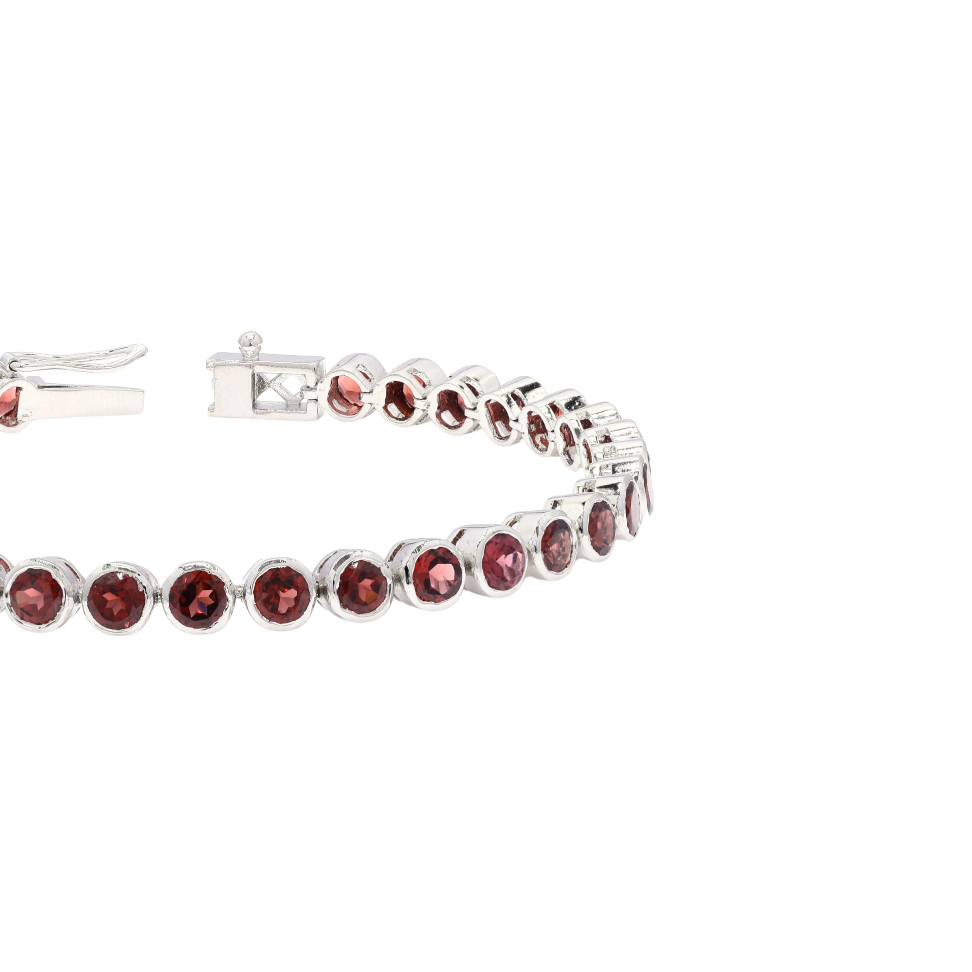 The Garnet Tennis Bracelet presents a stunning display of vibrant bezel set round cut Garnet, radiating a deep, serene glow. This meticulously crafted bracelet offers both elegance and a sense of calm. Garnet is known for its association with increased confidence, courage, and passion, promoting energy and vitality, and enhancing mental clarity and focus to overcome challenges.