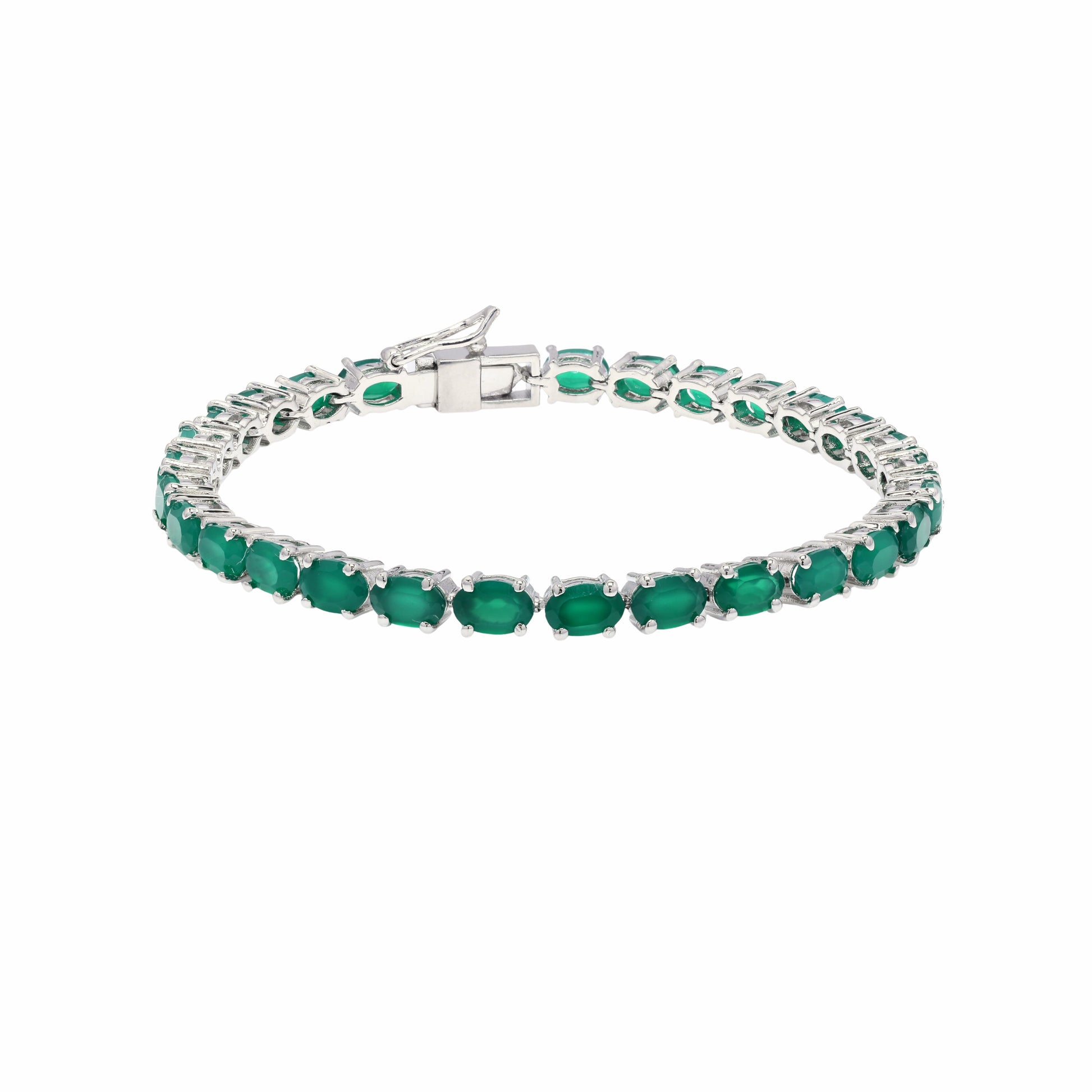 The Green Onyx Tennis Bracelet presents a stunning display of vibrant oval cut green onyx, radiating a deep, serene glow. This meticulously crafted bracelet offers both elegance and a sense of calm. Green Onyx is known for its association with strength and emotional balance, making it a beautiful and meaningful accessory. This bracelet can also be worm as a substitute of natural emerald.